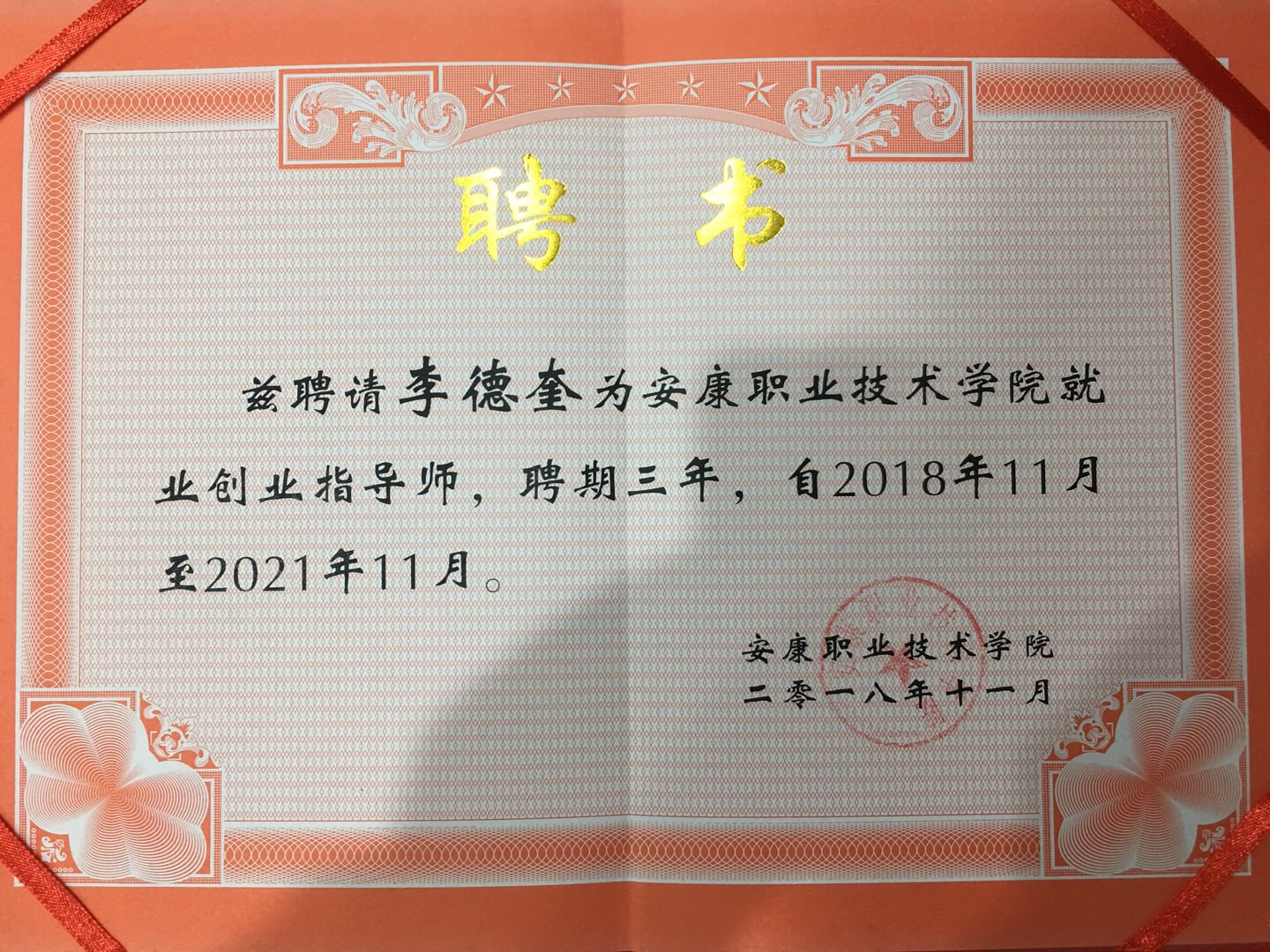 趙德安副院長(zhǎng)代表學(xué)院為李總頒發(fā)“安康職業(yè)技術(shù)學(xué)院就業(yè)創(chuàng)業(yè)指導(dǎo)師”聘書